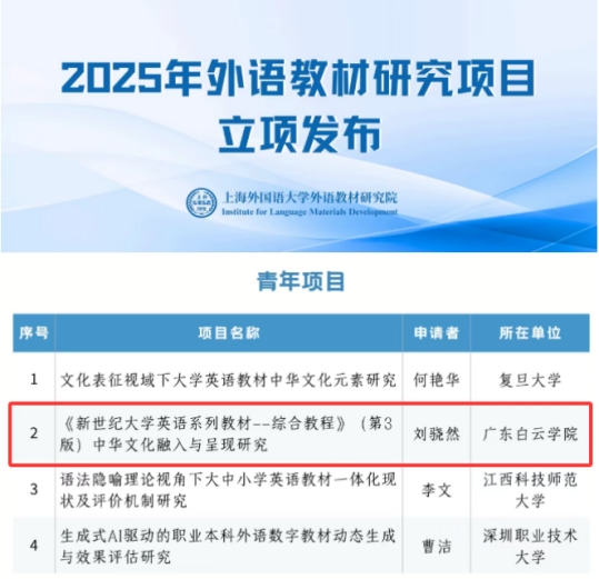 9月16日,上海外国语大学外语教材研究院“2025年外语教材研究项目”评审结果公布。经资格审核、线上评审、会议评审及复核审批等严格程序,我校外国语学院刘骁然博士申报的课题《〈新世纪大学英语系列教材——综合教程〉(第3版)中华文化融入与呈现研究》成功获批青年项目立项。