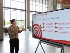为深入学习贯彻党的二十届四中全会精神,切实将全体党员的思想和行动统一到党中央的决策部署上来,11月27日下午,外国语学院英语第二学生党支部书记陈莹以“深学党的二十届四中全会精神,共绘现代化建设新蓝图”为主题,在图书馆一楼为全体党员进行了一场内容丰富、意义深刻的授课。