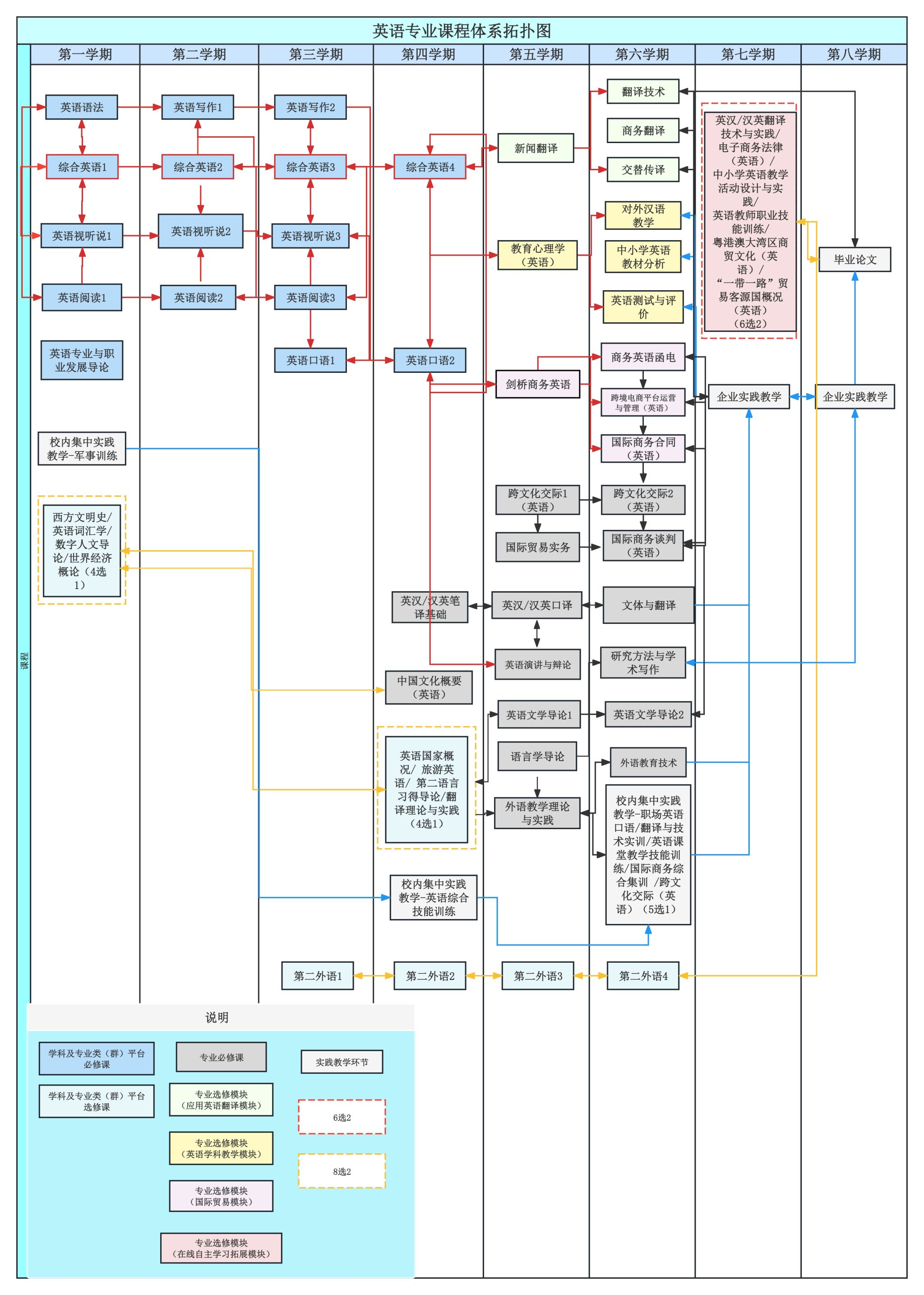 校内集中实践教学环节:英语综合技能训练、职场英语口语、翻译与技术实训、英语课堂教学技能训练、国际商务综合实训、跨文化交际(英语)